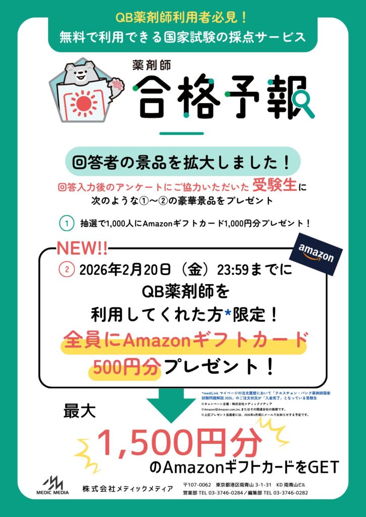 回答してくれた「QB薬剤師」を利用してくれた受験生全員はAmazonギフトカード500円分が必ずもらえる!