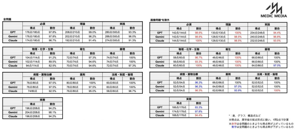 - 必須問題:GeminiおよびChatGPTが非常に高い得点率を記録しました。