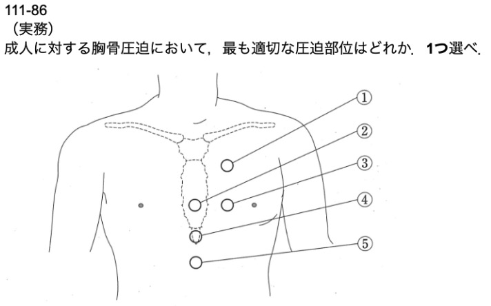 「3」成人の胸骨圧迫の適切な部位は「胸骨の下半分」である。薬剤師国家試験の典型的な図(第102回問109等)では、③が胸骨の下半分(胸の中央)に相当し、剣状突起(④)等を避けた適切な位置となる。