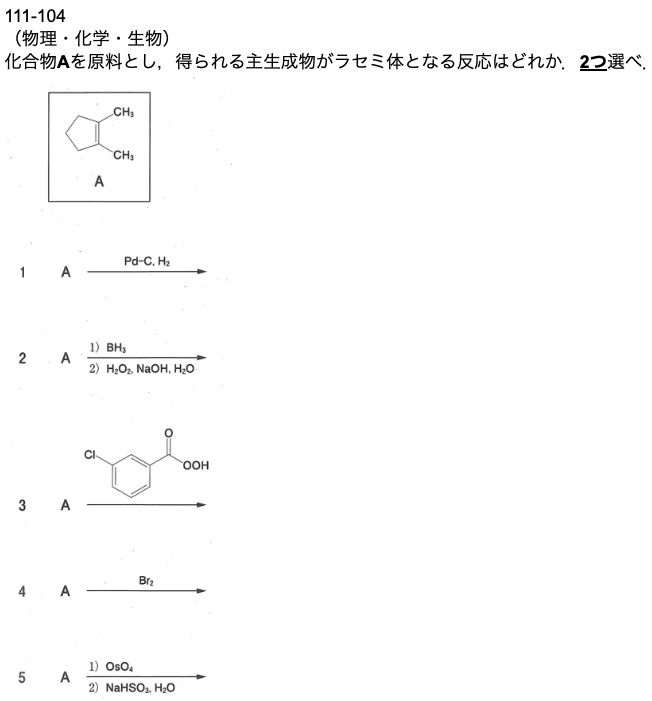 「3,4」化合物Aは1,2-ジメチルシクロペンテン。反応3のmCPBAによるエポキシ化と反応4のBr2付加はアルケンの両面から等確率で起こり、ラセミ体を与える。1,2,5はsyn付加でメソ化合物を生成。