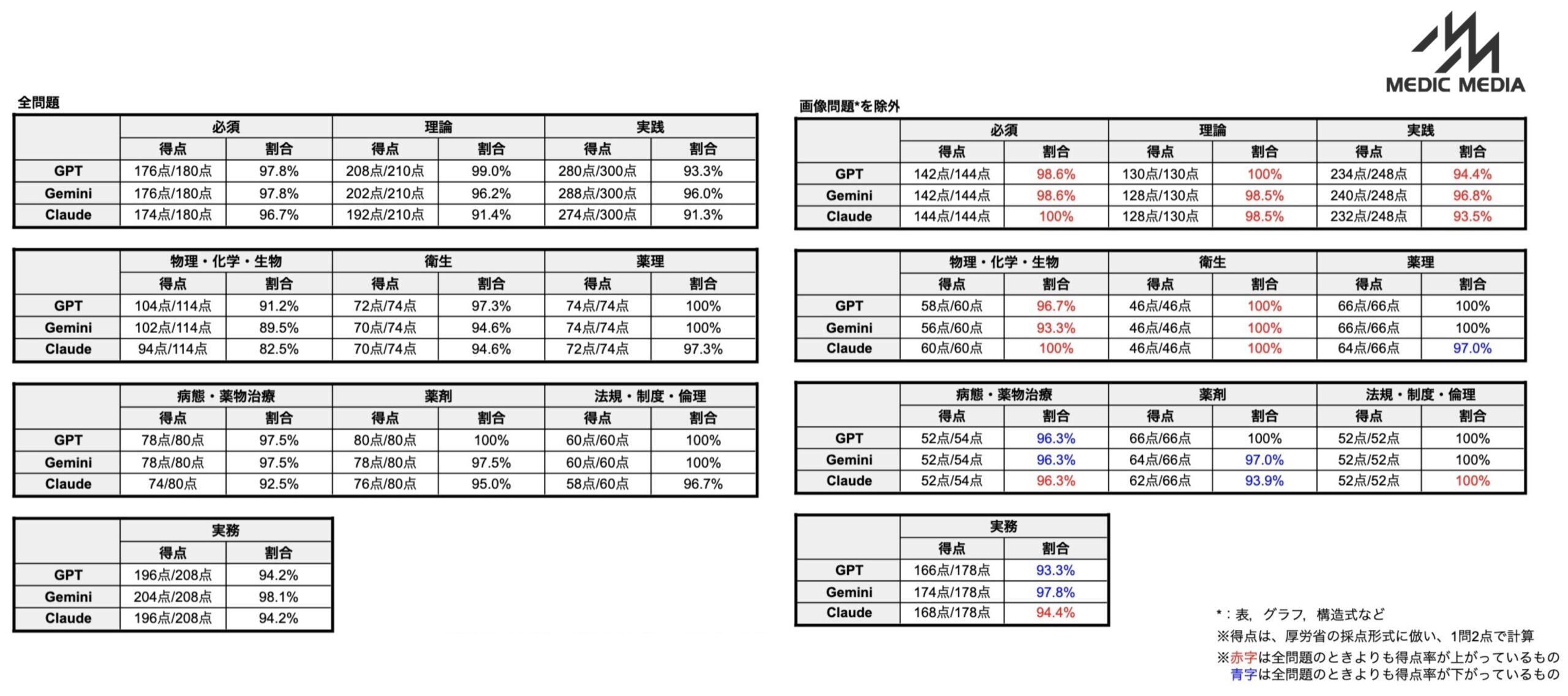- 必須問題:GeminiおよびChatGPTが非常に高い得点率を記録しました。