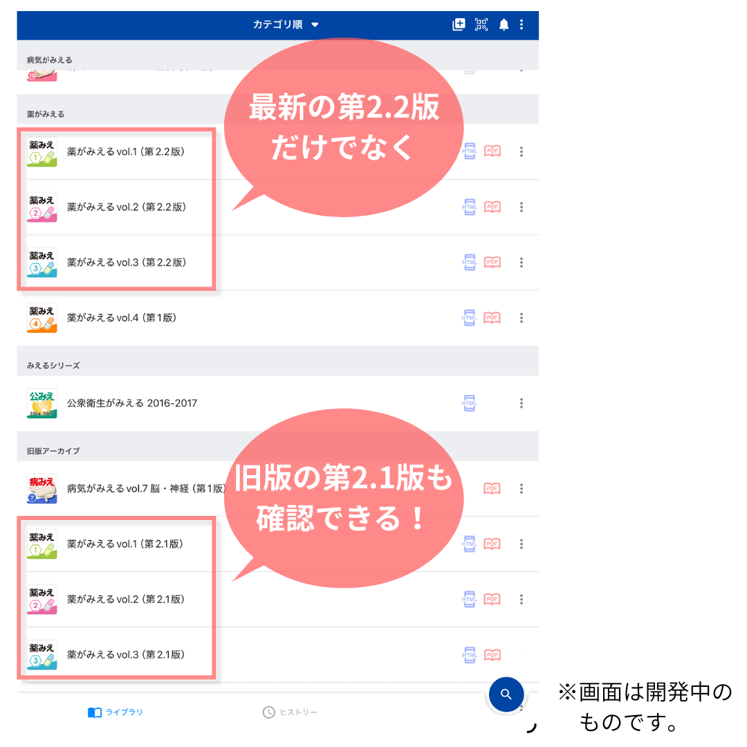 ※「薬がみえる」については第2.1版以降にのみ対応した機能です。第2版、第1版については、第2.2版を購入すると削除されます。