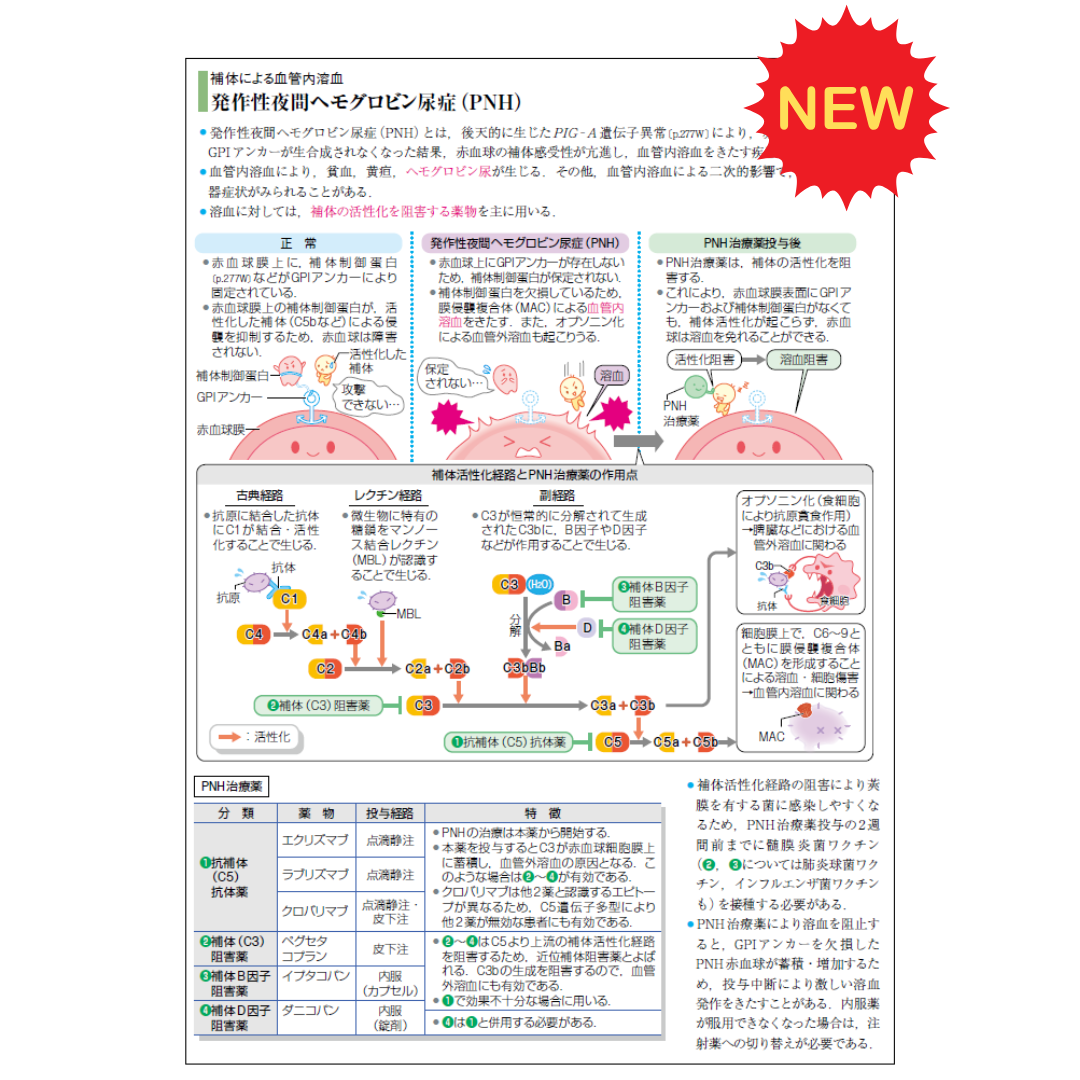 また、発作性夜間ヘモグロビン尿症については、近年適応を有する新薬が次々登場していること、薬剤師国家試験に治療薬が登場したことから、新規で解説を追加しています。