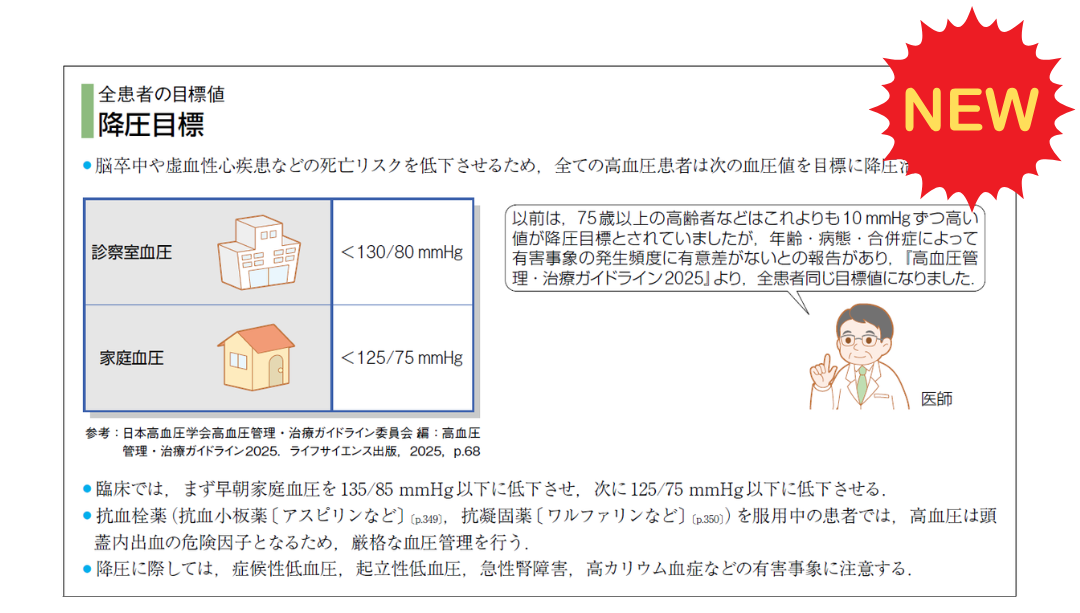 血圧異常の範囲は、『高血圧管理・治療ガイドライン2025』(日本高血圧学会)に対応しています。降圧目標の値や、降圧薬の分類法などが変わっています。